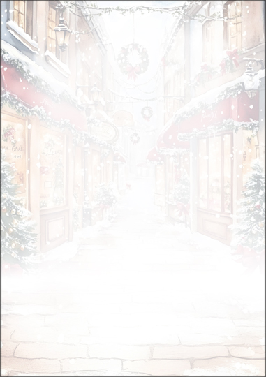 Dieses edle Briefpapier im Format A4 zeigt eine stimmungsvolle Strassenszene eines verschneiten Weihnachtsdorfes. Die liebevoll dekorierten Ladenfassaden mit Lichterketten, Kränzen und Tannenbäumen schaffen eine warme, einladende Atmosphäre – ideal für Ihre festliche Geschäftspost.