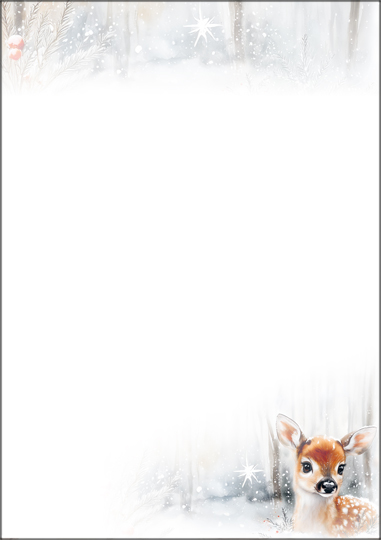Dieses hochwertige Briefpapier im Format A4 zeigt eine ruhige Waldszene mit feinem Schneefall und einem liebevoll illustrierten Rehkitz im Vordergrund. Die sanft verblasste obere Fläche bietet idealen Raum für Ihre persönliche Botschaft – sei es für Weihnachtsgrüsse, Einladungen oder saisonale Mitteilungen.